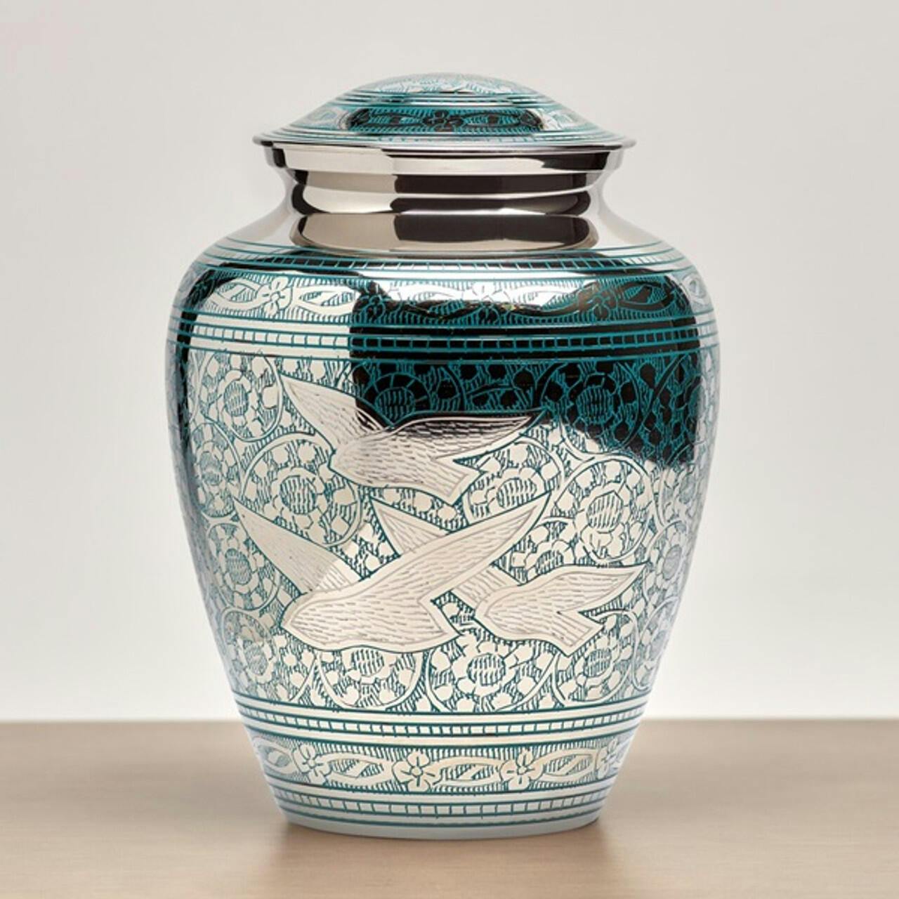 Each cremation urn undergoes a unique artistic process in northern India. Skilled artisans hand-etch doves and leafy decorations onto the bronze surface representing a going home and spiritual return home. The etched lines are then carefully filled with light blue and white paint, creating a visual masterpiece that celebrates the life of your loved one.