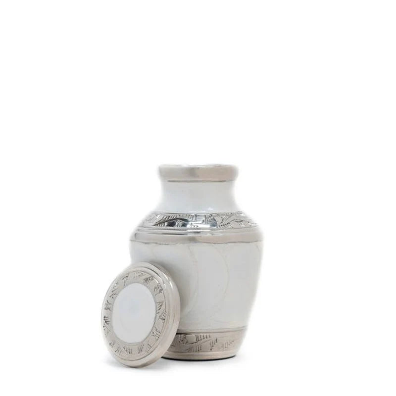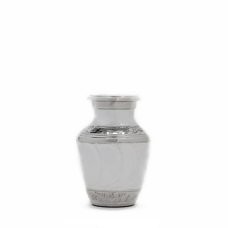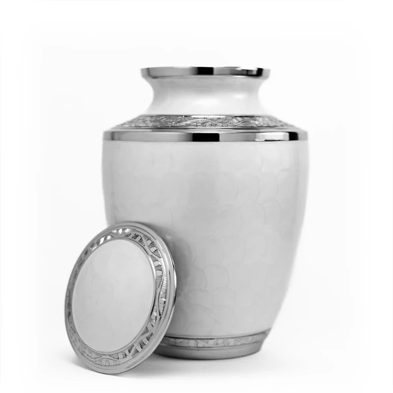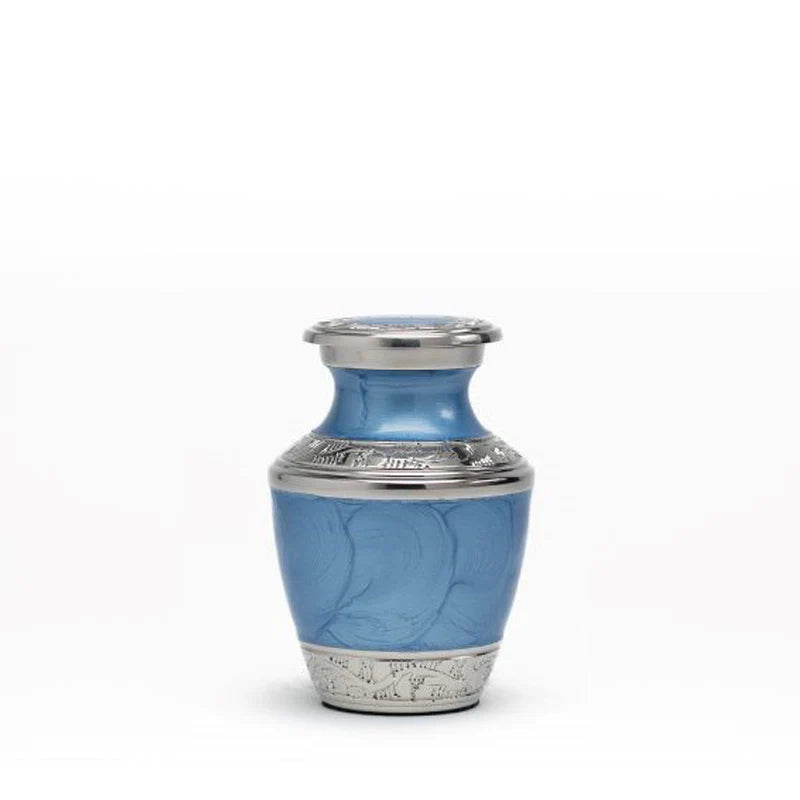 Our Contemporary Cremation Brass Urn is a testament to timeless elegance with a modern oceanic flair. This urn, finished with a blue or white metallic shimmer and a high gloss sheen, showcases unique and contemporary styling that pays homage to the beauty of the sea. The elegant enamel swirl pattern decorates the body, transforming the urn into a stunning work of art.