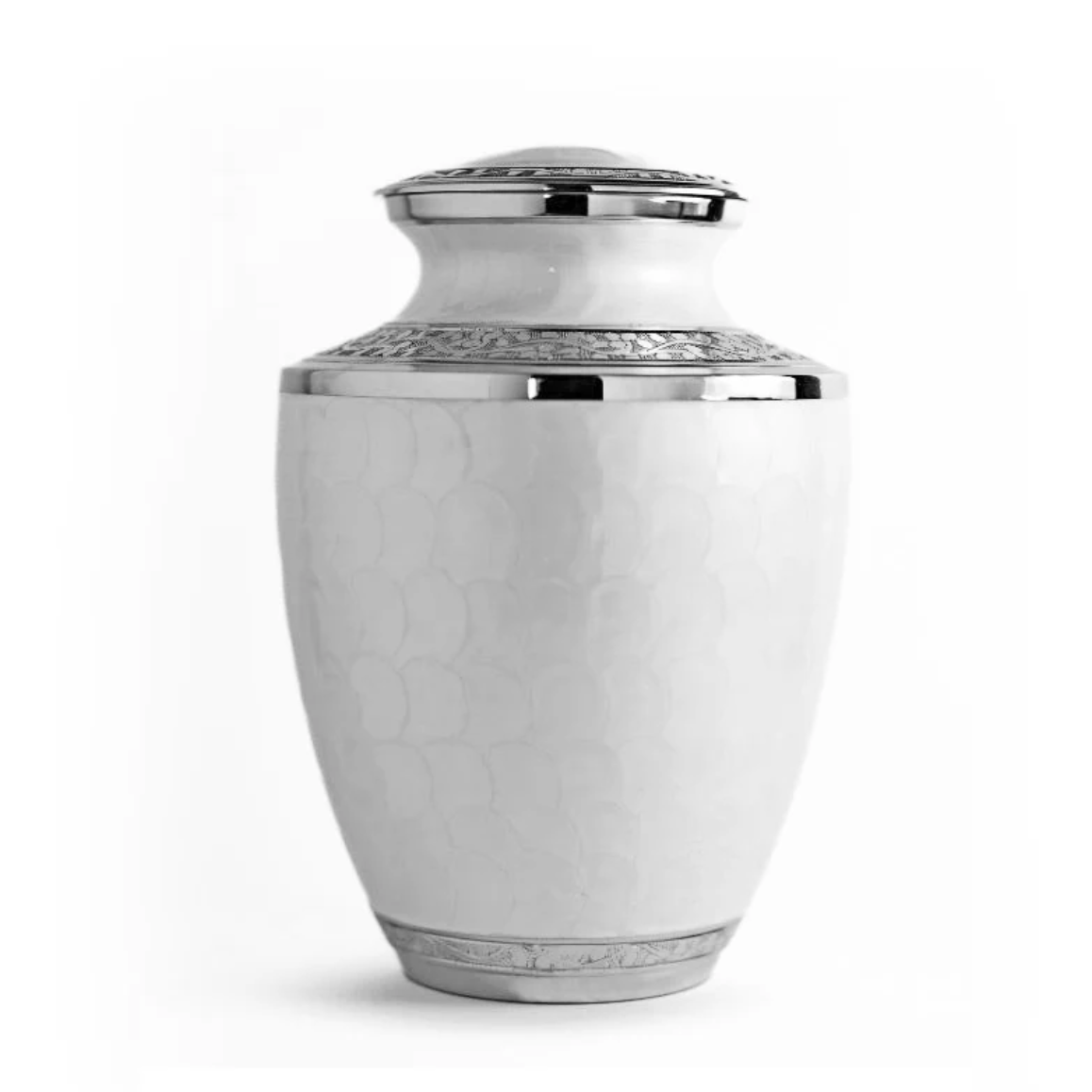 The urn is finished in a rich and beautiful blue or white, exuding an air of elegance and reverence. Decorative banding accents the midsection, adding a touch of sophistication and highlighting its classic design. Inspired by oceanic style, this urn combines timeless beauty with a sense of serene grandeur, making it a fitting tribute for a loved one.